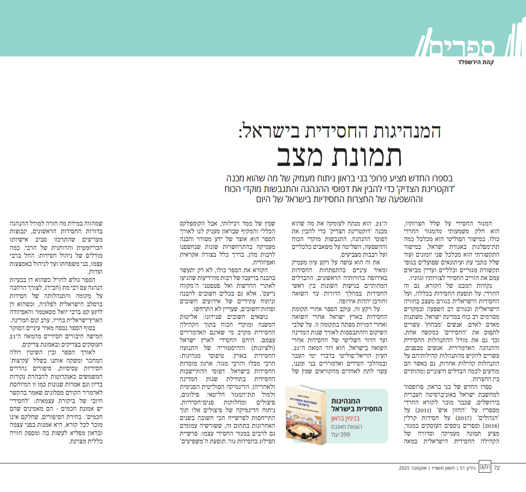 הספר המנהיגות החסידית בישראל עוקב אחר התמורות והגלגולים של החסידות בארץ: מן הדורות המייסדים ומשלב השיקום של התנועה עם הקמת המדינה ועד לאתגרים של הדור השלישי בימינו. הספר מתאר כיצד התבססה דמותו של הצדיק כמוקד של סמכות רוחנית, חברתית ופוליטית, ומציג ניתוח יסודי של האופן שבו דוקטרינת הצדיק הוותיקה ממשיכה לעצב את חיי החסידות – מההיבט הרוחני ועד הפוליטי – בישראל של ימינו.