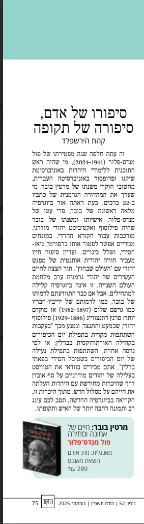 כתביו הפילוסופיים והתיאולוגיים של בובר, ובהם אני ואתה הנודע, תרמו רבות למחשבה הדתית והיהודית, וכן לחקר המקרא, לתיאוריה הפוליטית ולהגות הציונית. בביוגרפיה החדשה הזאת ממקם פול מנדס-פלור את מורשתו של בובר בתווך שבין החיים האינטלקטואליים והתרבותיים של יהדות גרמניה והחיים האירופיים במחצית הראשונה של המאה העשרים.